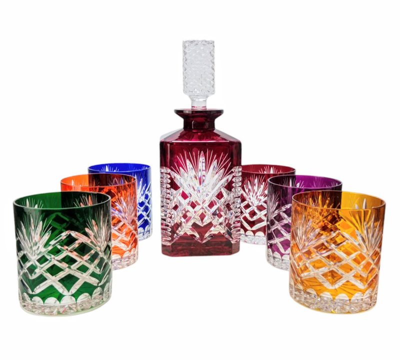- Un elegante set in cristallo composto dai seguenti due prodotti: Decanter per whisky in cristallo rubino Capacità: 700 ml Design: Olive check Colore: rubino Bicchieri da whisky in cristallo (6 pezzi) Capacità: 280 ml Altezza: 9,5 cm L